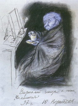 Лиля Пальвелева: Немудреная сказка, записанная Владимиром Далем, у Норштейна и Ярбусовой превратилась в щемяще грустную историю о двух существах, которым, казалось, на роду написано быть вместе, да вот не сложилось. А счастье было так возможно: И элегический пейзаж тому способствовал, и романтические руины старинной барской усадьбы, растворяющейся в топят и хлябях болота. Глядя на представленный на выставке рабочий макет и эскизы к "Цапле и журавлю", в очередной раз убеждаешься - настроение, атмосфера, световоздушная среда даже чрезвычайно важны для Ярбусовой и Норштейна. Добиться всех этих тонких эффектов можно лишь кропотливейшим и долгим ручным трудом. Компьютерных технологий, ускоряющих съемочный процесс, но и огрубляющих изображение, художник и режиссер не признают. В одной из витрин лежит с дюжину вырезанных из целлулоида Акакиев Акакиевичей. Это - почти одинаковые сгорбленные фигурки, каждая чуть меньше предыдущей. Они понадобились, чтобы, кадр за кадром, снять крошечный эпизод - Акакий Акакиевич уходит. "Шинель" - незавершенный, но бесспорный шедевр, и вот весьма примечательный рассказ Юрия Норштейна. Юрий Норштейн: В Канаде проводился конкурс на технические нововведения в кино. Там проводился фестиваль фильмов, которые были сделаны в компьютерной технике, в самой сложнейшей супертехнике. Там "Шинель" получила премию, и мне рассказывали, что в жюри долго ломали голову - как же сделан этот фильм? Потому что все, что они видели, не входило в привычные координаты нормы. Они понимали, что это не компьютер, это не то, это не это, но как?! По-моему, они так и остались в неведении. А на самом деле, я должен сказать, он делается самым примитивным, нормальным, плебейским образом, то есть руками, ручкой, иглой царапается, офортом, акварелью, титановыми белилами, самый весь материал, который у нас под ногами буквально. Ну, естественно, тут работа кинооператора Александра Жуковского просто божественная, потому что без него это вообще ничего не могло быть. Лиля Пальвелева: И, уж конечно, не могло бы быть без Франчески Ярбусовой. Юрий Норштейн: Она обладает какой-то для меня абсолютно непостижимой способностью превращать изображение в летучесть. Когда работа идет в том направлении, в котором нужно, я вижу, как изображение просто излетает из листа. Оно не ломкое, оно гибкое, оно пахучее, оно пряное, оно все живое. Это вовсе не означает, что у нас не бывает конфликтов, споров, что у нее сразу все получается. Лиля Пальвелева: Ах, и споры бывали, и готовые эскизы (свои и Франчески) в корзину выбрасывались. Говорит Наум Клейман, директор того самого Музея кино, из собрания которого сформирована часть экспозиции. Наум Клейман: Здесь большинство - это его собственное собрание: эскизы, детальки, все эти чешуйки, все то, из чего делается кино. Кое-что есть у нас, мы в свое время собирали, подбирали то, что Юрий Борисович не отдавал, кое-что дарил. Но я должен сказать, что у нас не очень большое по объему, но очень ценное собрание. Например, макет с военными, уходящими за горизонт с письмами из "Сказки сказок", это наша коллекция. Или как-то Юрий Борисович мне рассказывал, давно еще, до начала съемок, свой первый замысел. Я вытащил из-под его рук ту бумагу оберточную, на которой он рисовал эту историю. Это еще до того, как был написан сценарий Петрушевской. Просто так на па